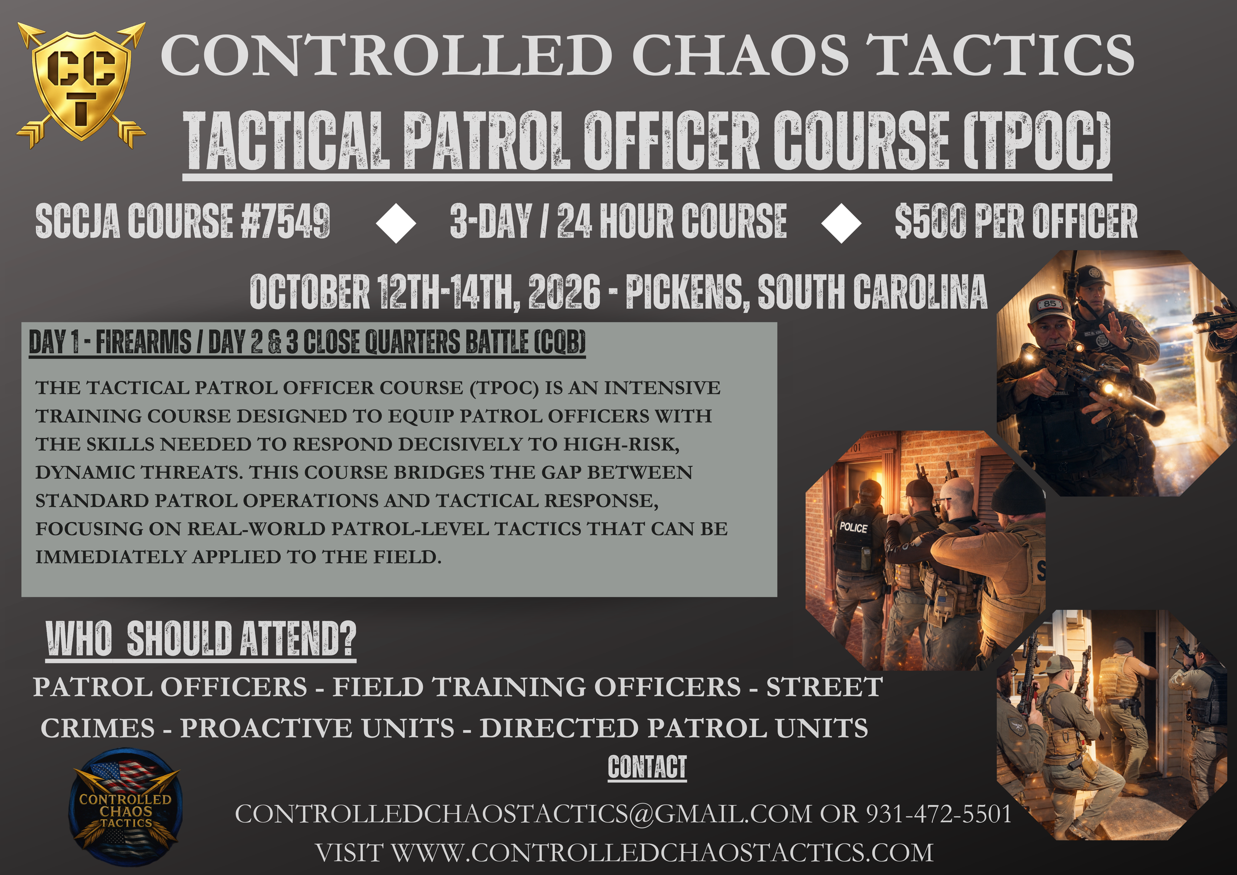 This course is an awesome opportunity to step up your game. The instructors have an incredible amount of knowledge that they are willing to share and give back to the rest of us. From start to finish the entire curriculum was set up for a purpose. From day one to day 5 you could see the improvement in each person whether the individual had prior knowledge/instruction or none at all. The instructors truly care about what they are teaching and you can see their passion for the subjects taught but also for each individual. You can see they want you to succeed and aren’t keeping any secrets for themselves. I love the high intensity paired with the instruction, its not just beating you down but they have purpose behind each task/challenge. In 5 days you can see the results and the confidence boost in each person. I had an awesome time and highly recommend Controlled CHAOS Tactics!
